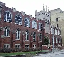 St. Michael's Choir School is located next to St. Michael's Cathedral Basilica and operates out of four buildings at 56, 66, 67 and 69 Bond Street. In 2016, the school's secondary school building, located at 69 Bond Street, was rated as in need of "critical" repairs and had the worst-performing score among Toronto Catholic District School Board secondary schools on the Ontario Ministry of Education's Facility Condition Index.[48] In June 2018, the Ministry of Education announced it would spend CAD $11.2 million to construct a new consolidated school building at 67 Bond Street designed by KPMB Architects.[49][50][51] In 2022, the school announced a revised redevelopment plan with a new six-storey design that incorporates the historic Gothic revival-style façade at 66 Bond Street.[52]