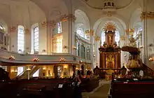 In 1786, a new construction following the design of Johann Leonhard Prey and Ernst Georg Sonnin was completed. This is the church as we know it today. It was reconstructed twice in the 20th century: after catching fire in 1906 during construction work and after the bombings of 1944 and 1945. After the 1906 fire, the photos of Wilhelm Weimar were used to help recreate the church.[1] Since 1983, renovation is ongoing: first the spire and then the roof.
