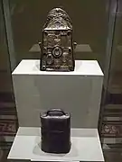 Saint's hand-bells were sometimes enshrined to give prestige to their owner. They were highly prized in the 10th and 11th centuries, although only some 15 survive. It is probable that the shrines were also used for swearing loyalty or legal oaths, and at times may have acted as battle standards.[16] St. Patrick's bell was enshrined c. 1100 by the High King of Ireland Domnall Ua Lochlainn (reigned 1094—1121 AD), and the bishop of Armagh.[17] The shrine is made from four trapezoidal plates joined at the corners by tubes, and further secured by a top-cap and a sliding base plate.[17] Its front is split between an upper crest and main body, and is decorated by a series of plates containing complex openwork designs and geometric cross-patterns.[18]