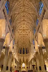 Monsignor Michael J. Lavelle started raising $625,000 from the congregation in 1926 to renovate the cathedral.[135] The next year, Robert J. Reiley was hired to conduct renovations, including replacing the wooden floor with a marble floor.[136] The floor was replaced between April and December 1927. The old organ was also replaced and new stained-glass windows, altar, and pews were being installed in the Lady chapel. The sanctuary was extended approximately 8 feet (2.4 m), the metal communion rail was replaced with a bronze and marble rail, and the wooden throne was replaced with one of marble.[137] Amplifiers,[138][139] wrought-iron doors,[140] and new bronze chandeliers were installed.[141] New pews were also installed,[142] as were two new organs.[143] English stained glass artist and designer Paul Vincent Woodroffe completed the Lady chapel's remaining windows by late 1930.[130][144] With the construction of Rockefeller Center to the west, several trees were planted around the cathedral in 1939 to complement Rockefeller Center's trees.[145]