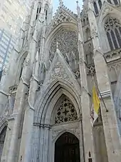 The central portion of the Fifth Avenue facade contains a 156-foot-tall (48 m) gable, which leads into the narthex.[33][101][205] The main entrance is an archway at the base of the gable, measuring 31 feet (9.4 m) wide and 51 feet (16 m) tall.[62] The actual entrance portal is recessed about 12 feet (3.7 m) into the archway and contains the main doors.[75][101] The top of the portal is slightly pointed, with carved spandrel panels on either side.[101] Above is a marble transom bar as well as elaborate floral tracery.[62][101] The portal is flanked by decorative jambs, which in turn are topped by foliage capitals. Atop the jambs are a set of buttresses, which converge to form pointed arches.[101] A gablet rises over the main portal and contains tracery paneling and a shield bearing the arms of the Archdiocese of New York.[75][101]