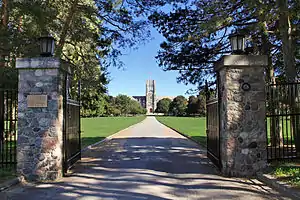 The 25-acre riverside site on which the Seminary stands was donated by Sir Philip Pocock, from a prominent London Catholic family. The Seminary is constructed of Credit Valley stone, and is designed in the Collegiate Gothic style. The cornerstone of the present building was laid by Bishop Fallon on May 31, 1925, and the official opening of the St. Peter's Seminary building was celebrated on September 29, 1926.[2] The main entrance rotunda features a marble statue of St. Michael the archangel, carved in Rome and presented from Bishop Fallon upon the Seminary's opening.