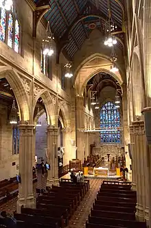 The erection of a chapter house was first mooted in 1883 to provide a synod hall in memory of Bishop Barker. Its construction was approved unanimously by the chapter and synod. Cyril Blacket, Edmund Blacket's son, was appointed as architect. The foundation stone was laid on 30 November 1885 and construction completed in 1886. The choice of site was limited, the south west corner of the site being the only vaguely suitable one. Even this was restricted. In 1916 additions enlarging the chapter house were completed by Wiltshire and Day. Calls for further enlargement continued but nothing was done due to the difficulty of the task.[2] The St Andrew's Cathedral Conservation Plan, 1999 by Paul Davies contains further detailed information on the chapter house, external works and structures, additions to the cathedral exterior, internal layout, 1941 reorientation, ventilation, organs, bells, architects and furniture.[2]