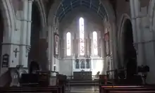 In 1882, a temporary corrugated iron building or "tin tabernacle" was erected on the plot to serve as a chapel of ease to St John The Baptist's Church,[4] and was provisionally called the Cotton Memorial Church.[2] Initially, the services were conducted by the clergy of St John's,[5] but William Manning was appointed as the first incumbent in 1885.[6] Work started on a large new church building to the design of Sir Arthur Blomfield, funded jointly by the Cotton family, the Bishop of St Alban's Fund and by the new congregation.[5] The foundation stone was laid by Prince Arthur, Duke of Connaught in a ceremony on 18 June 1886, which was also attended by the Lord Mayor of London and five bishops;[2] an account of the construction work by Woodward and Wilson, and a copy of The Times were sealed under the stone.[7] The chancel was funded by the Cotton family as a memorial to William Cotton and was built to the highest standards;[2] this and the first three bays of the nave were completed and closed off with a temporary wall so that the church could be consecrated and opened for services;[5] the ceremony was conducted by Thomas Legh Claughton, the Bishop of St Albans on 30 April 1887.[7] It became a separate ecclesiastical parish on 29 December 1887 and Manning became the first vicar. The congregation set about raising the £2,500 to complete the west end of the building,[5] which when finished was dedicated by Bishop Claughton on Maundy Thursday, 30 March 1893.[7]