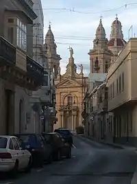 In 1691 the choir of the church of St Andrew was given a baroque style look. Works were carried out by Giuseppe Casanova the following year. In 1699 two bell towers were built on designs by Lorenzo Gafà. In 1757 the pulpit of the church was finished. It was carved in wood by Pietru Saliba. In 1779 the titular statue of St Andrew was sculpted in wood by Giuseppe Scolaro. On 7 December 1783 the new parish church was consecrated by Bishop Vincenzo Labini.[2] In 1785 Bishop Labini ordered that a set of Stations of the Cross should be installed in the church. Moreover, the same bishop commissioned a new organ for the church which was brought from Naples in 1792. In 1813 four new statues were built outside the church in a time when the village was infected with the plague.[3] Between 1901 and 1910 the church was further enlarged, but was nearly completely destroyed by enemy bombing during World War II considering the fact that it is so close to the airport. It was rebuilt between 1945 and 1954 and re-consecrated by Archbishop Gonzi on 26 September 1962.[4] The extension of the church and the rebuilding of the copula are of the design by Andrea Micallef.[5]