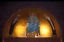 Other artwork in the church includes the apse painting, two icons and two triptychs designed and painted by Fleur Kelly in the late 1980s and 1990s. The apse painting consists of the central figure of Christ Pantocator with Mary and Child and an elderly St Augustine. The icons to the sides of the apse are of Pope Gregory the Great and King Ethelbert of Kent. The triptychs are of the Virgin Mary and Child, and St Augustine holding a model of the current church.