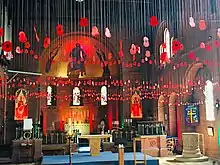 In 2018, a display of 1,300 poppies commemorated the 100th anniversary of the Armistice and the end of World War One.[4] The poppies were made by pupils of Even Swindon Primary School and church members, and hung on thin lines so that they appeared to float above the congregation and visitor alike. Other displays included a cascade of knitted poppies over the font and from the high altar, "There but Not There" silhouettes, and information on the local men who never came home.[5] Photos of the displays were included in most UK national newspapers and the church was used by BBC Points West for a live broadcast of their evening news programme on 9 November 2018, the Friday before Remembrance Sunday. The programme was anchored by Alex Lovell.