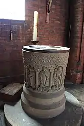 The font is an exact replica of the fine Norman font at St Leonard's Church Stanton Fitzwarren. It is divided into ten compartments, each with a Latin inscription. The first, Eclesia stands for the church – and the carving is of the crowned Divine Bride, holding the sacred chalice and killing evil (depicted as a serpent) with the stem of the cross. The second compartment, inscribed Cherubim shows a six winged cherubim, with its eyes covered to show its spiritual nature. The Cherubim holds a sword to show it is guardian of the Church.