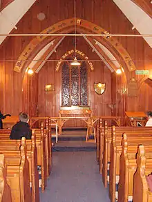 The church is set in woodland and is surrounded by a cemetery. Otago's first Anglican Bishop, Samuel Tarratt Nevill was buried here in 1921.[1] A traditional lych gate marks the entrance from Coast Road. The church is built in board and batten with a wooden shingle roof and a small copper-tipped tower, fitted with a bell inside. The stained glass windows are unusually elaborate for such a small building. They depict among others St. Joan of Arc and Christ the Redeemer. They have been said to have been ordered for a Roman Catholic church in Brisbane but diverted to Dunedin following a waterfront dispute.[1] However recent research has found this to be mythical, and the real story of their original destination is even more complicated and interesting. The building is listed as a Category II Historic Place.[3]