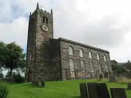 The present church was built about 1781; the earlier building was demolished and the new church was built on a site to the north. It is of coursed ashlar; it has a rectangular nave, with no separate chancel, with five rounded-headed windows on each side; there is a west tower. In 1812 the walls were raised to allow a south gallery (which was later removed) and a west gallery; an upper arcade of windows, of similar shape to those below, was added. There is an external staircase leading to the west gallery. In 1852 an organ was installed in the south gallery, and later was placed on the south side of the chancel. In 1948–49 a false ceiling was installed, so the upper windows can be seen only from the outside.[1][2][4]
