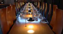 The college celebrates its patron saint each year with a special Catz Night dinner, attended by junior and senior members of the college. Every three years the college also holds a ball, usually off-site due to the problem of securing the college's perimeter sufficiently for insurance purposes. St. Catherine's is also known for its more modern approaches, such as by not usually requiring students to wear gowns for dinners and voting to end the tradition of standing when the Master enters the hall at formal dinner,[33] although most students still continue in this practice out of respect. The College also holds fortnightly social events called 'Entz', which are usually themed and hosted in the JCR and bar, and an annual Catz Artz Week which showcases creative talents.[34]