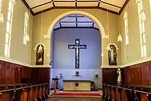 Toward the end of 1968 the school decided, in conjunction with its sister school St Dominic's in Boksburg, to cater for primary school pupils only: girls up to standard 5 (grade 7) and boys up to standard 1 (grade 3). Additionally, in 1970 the Transvaal Education Department recognised and registered the St Catherine's pre-primary school. The first reported ghost sighting at St Catherine's occurred on 17 August 1972, when a janitor cleaning the school hall after hours claimed to have been chased into the quad by an amorphous grey apparition or "spook" with "glowing red eyes".[2] From the beginning of 1977, a wave of sightings followed of a "grey, hooded figure swaddled in flowing robes", often accompanied by a "'wailing' sound". The ghost, said to haunt the school hall, the chapel, the basement and a number of classrooms in the eastern wing, was soon dubbed Patrick, after one of the school's houses, St Patrick's.[2] After 1977, ghost sightings at St Catherine's mostly ceased, although stories of paranormal happenings at the school persist to the present.[1]