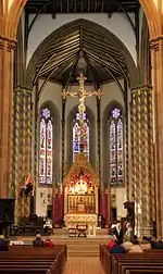 In the 1960s a number of the fittings, including Pugin's screen, were removed and the interior repainted, to the detriment of the original design.[3][8] The rood screen was rescued by an Anglican priest, who had it re-erected in the Anglican Holy Trinity Church, Reading.[9] Other artefacts were removed to other churches, including the giant rood crucifix, which after its removal to the Church of the Sacred Heart & St Therese, in Coleshill, was reinstated in the cathedral within the Sanctuary on the instructions of Archbishop Maurice Couve de Murville. The Cathedral as it appears today is a result of post-Vatican II renovations and re-orderings, with only some of Pugin's work surviving. The original chancel arrangement was altered, again much to the detriment of its design, destroying Pugin's intent. Its appearance today is a mere shadow of how it was originally conceived by Pugin, but its enduring beauty in the face of iconoclasm is testament to the skill of its original designers. St Barnabas Cathedral in Nottingham, also by Pugin, suffered similarly, with much of the original decoration smothered with whitewash, and fittings destroyed.