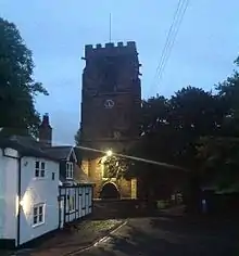 The church is built of red sandstone ashlar with a lead roof.[2] Its plan consists of a tower at the west end, a nave with aisles, a chancel, a vestry to the northeast, and a southeast porch. At the east end of each aisle is a chapel.[7] The porch has two storeys, the upper projecting over the lower one.[4] Most of the church is in Perpendicular style although the east window is Decorated.[8]
