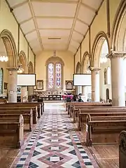 The interior underwent a major refurbishment in the 1870s. In 1871 the original Georgian box-pews and benches were replaced by the present ‘Neo-Norman’ pews, arranged in four blocks divided by a newly tiled nave and two newly positioned side aisles. The West Gallery was taken down in 1876. The refurbishments were the work of Edward George Bruton (1826-1899), an Oxford-based architect who specialised in ecclesiastical commissions in Oxfordshire and Buckinghamshire and were largely paid for by members of the wealthy Morrell brewing family[14] of Headington Hill Hall.[15] The Morrells were closely associated with St Clement's for much of the 19th and early 20th centuries and were significant benefactors to the church and parish.