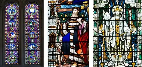 The "Seven Churches" window in the north-west corner of the church was given by Emily Alicia Morrell of Headington Hill Hall in memory of her late husband, George Herbert Morrell, MP (1845-1906). It is based on Christ's letters to the Seven Churches of Asia in Revelation (1:12–3:22). The subject is unusual, and suggests a deliberate choice by Mrs Morrell of a Bible passage of particular relevance to her or her family.[23] The window is of painted glass and was installed in 1908. It was designed by Powell & Sons of Whitefriars Glassworks, London. Powell was closely associated with William Morris and the Arts and Crafts movement.[24] This influence is clearly apparent from features such as the use of red wings for angels.[23]