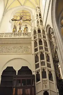 This was situated unconventionally to the middle of the main nave length by which a unique central hall space was created. The statue portal decoration of a main nave and side aisles were inspired by Gothic buildings in Prague and Kraków, and was included in the second construction stage. The influence of Parler's masonry at Prague's Saint Vitus Cathedral from the second half of the 14th century became evident in the King's Oratory and its spiral staircase as well as a motif of round banisters of oratory and a stone gallery over the sacristy.
