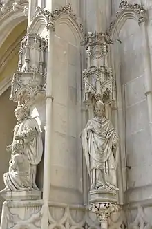 The niches are original and it is not known what statues stood on them during the last centuries. The other Neo-Gothic statues decorate the portal of the east gavel. The statues are Ugarian kings Charles I of Hungary, his wife Elisabeth of Poland and Louis of Hungary. They are masterpieces of the Budapest sculptor Lajos Lantay.