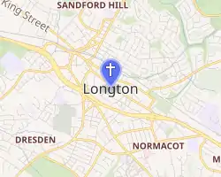 St James-the-Less is a Commissioners' church which was built in 1833-4. It cost £10,000. With a capacity of 2000, it was intended to provide for the rapidly growing population of Longton. Other Commissioners' churches were built in the Staffordshire Potteries around the same time, for example, St Mark's, Shelton, which is slightly larger.[1] Not long after the completion of St James', one writer suggested that its size was perhaps optimistic given the strength of Nonconformist denominations in the area.[2] However, it is still an active parish church.[3]