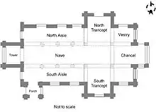 The church was restored very heavily in 1876[2] by the architect J. P. St Aubyn[1][5] at a cost of £4,400[14] (equivalent to £423,155[nb 4] in 2022). The north and south transepts were added at this time as well as the whole south aisle of the nave, the chancel, a clerestory and a new porch.[2]