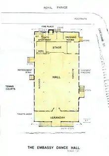 The Embassy Dance Hall, and then the Ambassador Theatre, occupied the same building at different periods. It was located on the west corner of Gresham Street and Royal Parade, St John's Wood.[36] Construction occurred in 1928 and was built for Frank Fraser Ltd.[37] It was an all timber structure of 33.5m x 17m with a 6.5m ceiling height. Entry was from the Enoggera Creek end via a twin flight of stairs to a wide verandah. The Hall had side alcoves, a raised stage, two change rooms, a small apartment and a side refreshment counter. Male and female toilets were under the building at the creek end.[38]