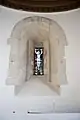 The nave is coated with plaster with an open collar-beam roof. Remains of medieval wall paintings were uncovered during restoration work in 1938 by William Weir.[3]