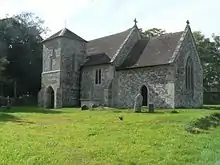 The small church was built of flint and limestone, in the 12th century. The three bay nave is 33 feet 6 inches (10.21 m) by 16 feet 4 inches (4.98 m), while the chancel is just 18 feet 9 inches (5.72 m) long and 13 feet 3 inches (4.04 m) wide. The entrance is beneath the small two-stage south tower which was added in the 14th century,[5][4] and is supported by diagonal buttresses. The tower holds two bells dating from 1725 and 1766. The church roof is tiled in a fish-scale pattern.[1] Monuments inside the church include those to George Howe, who died in 1647, and his six children.[6] The cylindrical stone font with a brass cover, the lintel over the blocked north doorway, and a sculptured relief of the Lamb of God over the inside of the south doorway date from the Norman era.[2][1]