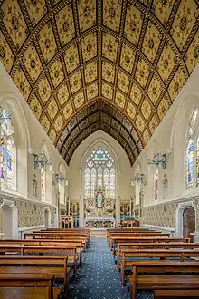 The church was designed by Augustus Pugin[2] in 1837 to replace a small Gothic building in nearby Chapel Street.[3] It was Pugin's first expression of his Gothic Revival style. He originally planned for the tower to have a 100 feet (30 m) spire, but budget restrictions prevented this from being implemented.[4] His final design was presented on 17 March 1838, and construction began that same year, with the foundation stone being laid in July 1838.[5] Building was completed by 9 October 1839, when the dedication service took place with Cardinal Nicholas Wiseman preaching.[5] The cost of construction had been £1,400. The wood sedilia in the sanctuary was donated to the church by Pugin.[5]