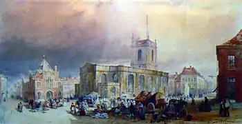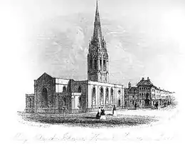 By the mid 19th century there was much enthusiasm to rebuild the church in a Victorian Gothic style. A new building would also serve as a memorial to the former Vicar Rev. Henry Lonsdale, brother of Bishop Lonsdale who died in 1851 and was buried beneath the west tower.[3] In 1853 the tower was lowered and remodelled in a Victorian Gothic style, complete with steeple under a design by George Edmund Street. The architect also submitted a design for the main body of the church, but due to lack of funds rebuilding of the main church did not commence until 1868.[2] For the last 15 years of the neoclassical style church it consisted of a gothic tower with spire and neoclassical style main body encased in stucco, the body of the church was demolished in 1868 after standing for 147 years.