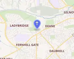 The church of St Mary is situated in the old township of Rumworth on high ground above the Church Brook, the Saxon Kirkbroke, which flows through Deane Clough to the River Croal.[2] St Mary, or St Mariden was a chapel of ease of St Mary in Eccles before becoming the mother church of the ancient ecclesiastical parish of Deane which was formed from the northern part of the parish of Eccles and takes its name from Deane Clough, the narrow wooded valley close to the west of the church. The church originated as a 14th-century structure consisting of a nave and chancel with a steeply pitched roof and a western tower which has since been considerably enlarged and altered.[3]