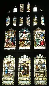 Pevsner describes the reredos and altar designed by Austin and Paley as "extremely handsome" and "gorgeously painted" in gold, red and green by Shrigley and Hunt.[10] Stained glass windows installed between 1887 and 1933 in the Lady chapel, south aisle and several in north aisle are also by Shrigley and Hunt while others including the east window are by Charles Eamer Kempe.[2] The Speakman window is of interest as it depicts scenes from the industries on which Leigh was built, panels include weavers, engineers and colliers.[15]