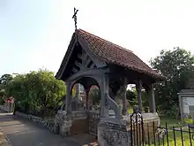 At the entrance to St Nicholas' churchyard is the church lychgate. Being included in the village conservation area, it is a locally protected structure. Next to the lychgate is an octagonal Grade II listed cross base and shaft, dating from the 14th century with 19th-century additions.[16]