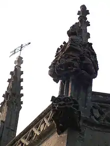 The Perpendicular clerestory windows north and south are 15th-century, each with three lights, topped with cinquefoil moulded surrounds, and edged above with hood moulding. Part of a blocked roundel window, above the east bay of the south arcade, is evidence of earlier circular 10th-century clerestory windows. The clerestory parapet is horizontally straight, set with a raised latticework frieze with quatrefoil moulding, and shields within the alternate central rhombus devices. Upon the parapet and between the windows are crocketed pinnacles supported by reused 15th-century grotesque corbels, below which are roof drain holes. The unusual pinnacle on the south-east corner of the nave is referred to by Pevsner: "But what is the strange en-crusted canopy at the SE corner". This pinnacle is a representation of the arms of the Myddleton family, Fulbeck manor owners of the 15th century, and includes a Wyvern and Harpy supporting a shield containing a lion rampant, surmounted by a Saracen's head. The south porch dates from the 14th century, is gabled, with side windows and side stone benches. The north and south aisle roofs are both 19th-century. The south aisle pointed-arch east window of three lights, and the south wall's two windows of four lights, are all 14th-century, and contain trefoil heads and quatrefoils, with hood mould surrounds.[1][7][14]