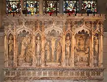 - Sir Thomas Chaloner, d. 1615,[3] and his two wives, d. 1603 and 1615, heraldic achievement over baldachino, stone curtains held open by figures on sides; kneeling figures of Sir Thomas and his wife