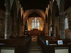 The church was again renovated starting in 1887. After a closure of 5 weeks, the church reopened on 2 September 1888. The ceiling of lath and plaster which covered the central aisle of the nave was removed. The pillars, arches and north and west walls were stripped of paint and plaster.[9] A new chancel was added in 1887-9 by George Fowler Jones, a York architect, and later extended in 1906. This contains the five-light 15th-century east window. Despite these changes the architectural style is broadly 15th century.[10]
