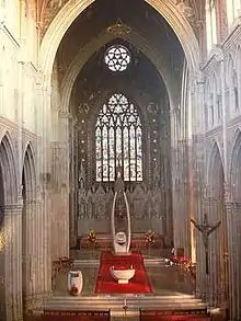 Behind the rood screen, McCarthy's reredos was retained intact but its lower portions were enriched with marble inlays in a diaper pattern with fleur de lis in a vibrant variety of coloured Italian marbles. A new Lady Altar and tabernacle was constructed before the reredos from statuary marble. The antependium contained three bas-relief groups, the work of the eminent Roman sculptor Michele Trepisciano (1860–1913) showing "The Presentation of the Blessed Virgin in the Temple", "The Assumption" and "The Coronation of the Virgin" recessed in separate panels with cusped heads, and columns of Breccia di Seravezza antica and Breccia Corallina marbles. The tabernacle, inlaid with Corsican Jasper, was in the form of a cube topped with a roof of fish scale carvings and finished with two large statuary marble standing angels.