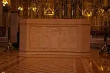 The altar was inspired by early-Irish crosses and has imagery of Christ (Crucified, Risen, Return in Glory), flanked by Apostles, on three sides. The fourth side visible from the main body of the Church shows Our Lord with four Irish saints: St. Patrick, St. Malachy, St. Brigid and St. Oliver Plunkett. Two pairs of brass gates which had survived from the 1899 marble Rood Screen were replicated several times over, welded together, topped with an entirely unconvincing poor quality Gothic cresting and made into a new fully brass screen behind the high altar, restoring a separate Lady Chapel area as the culmination of an ambulatory around the sanctuary area. The tabernacle was removed to the South transept which was itself screened off with further brass screens and the Cathedra placed on a dais directly behind the new altar. An Evangelarium was created in the South tower (now converted to a shop) and the baptistry was restored at the base of the North tower. The base of McCarthy's reredos was restored and the 1904 inlaid marbles uncovered. By the time of the rededication of the cathedral on 25 May 2003, more than £6,000,000 had been spent.