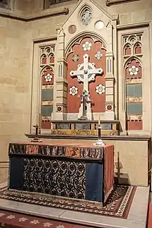 A reredosa decorative structure behind the altarwas installed in 1904. It was finished considerably later and dedicated on 6 March 1910 by Bishop Arthur Nutter Thomas.[14] The reredos, containing 23 coloured and gilded panels plus carved figures, is 34 feet (10.4 m) high.[14] This structure was built at St Sidwells Art Works, Tiverton, England to a design by T. H. Lyon.[15] The reredos features Christ in the centre panel, with saints filling the surrounding niches. Four coloured panels below the figure of Christ depict events in the life of St Peter, the patron saint of the cathedral. The cathedral has significant fine-quality stained glass windows. James Powell and Sons made three that were unveiled in the Lady chapel in November 1900. The southern transept window is the largest stained glass window in the cathedral and was dedicated in August 1926. A window representing Saint Cecilia, patron saint of church music, was unveiled in 1876 in the pulpit side of the chancel, though by 1969 it was ironically concealed by the organ. Windows elsewhere were funded and influenced by bequests. Amongst these Charles Beaumont Howard's memory is commemorated by a window in the chancel, Sir Anthony Musgrave's daughter Joyce Harriet by one in the sacristy and churchman Richard Bowen Colley by another window in the chancel.[16] The remains of the English biologist and statistician Ronald Fisher are interred within the cathedral.[17]