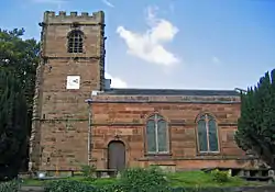 The existence of a church on the site was recorded in 1190.[7] The present west tower was erected between 1490 and 1526. The body of the church was rebuilt in stone in 1800 following a bequest from Ralph Kirkham, a wealthy merchant of Manchester. This consisted of a nave and sanctuary with no architectural division, which Richards describes as being "a poor attempt at imitation of the classical style".[5] The Egerton family of nearby Oulton Hall were benefactors of the church. Their family vault was in the church. This was sealed in 1870.[7] In 1870–71 the interior was restored by the Chester architect John Douglas, the restoration including the removal of pews, a gallery and the ceiling.[8] By 1936 the roof timbers were becoming unsafe and they were replaced by a steel roof.[5]