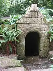 St Peter's Well is a Category B Listed Building, rectangular in shape with a flat ridge or 'saddle-shaped' top and a steeply pitched roof with little ornamentation other than a chamfer on the arch at the entrance. A stone appears to be missing at the closed northern 'gable' end of the well house and no clear indications remain as to whether any form of religious ornamentation existed, such as crosses, ever formed a part of the building. Several cup shaped depressions exist on the ridge and it seems logical that originally another course existed, most likely a single stone extending the length of the building that would seal the building by cover the cross joints of the second course and make it water tight.[3]