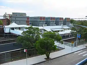 Located on the footbridge, the overhead booking office is extensively altered and includes a fibro ticket office with a hipped corrugated steel roof and a small fibro shop, also with a hipped corrugated steel roof, and a modern awning structure.[2]