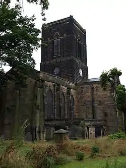 The current building dates from 1837 and it was designed by Thomas Rickman and built by W. Surplice of Nottingham.[3] It was one of the earliest Gothic Revival buildings in Nottinghamshire.[4] It is a Commissioners' church, having been given a grant towards the cost of its construction by the Church Building Commission; the full cost of the church was £4,511 (equivalent to £410,000 in 2020),[5] towards which the Commission granted £1,303.[6] The clock was installed by Reuben Bosworth.