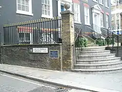 St Thomas' was, with the majority of the churches in the City, destroyed by the Great fire in 1666., Following the fire, a Rebuilding Act was passed and a committee set up under Sir Christopher Wren to decide which would be rebuilt.[5] Fifty-one were chosen, but St Thomas the Apostle was not among them.[6] Instead the parish was united with that of St Mary Aldermary. Part of the site was used for the creation of Queen Street, though a small portion of the churchyard survived.[1]