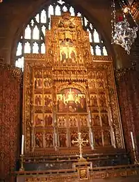 A brass cross on the super-altar was designed by Arthur Blomfield in 1886. The medieval font from about 1496 has an ornate cover shaped like a church spire designed by Sir Walter Tapper in 1899 to celebrate the Diamond Jubilee of Queen Victoria. The cover's interior is decorated with carvings of Edward the Confessor, St Hugh and St Wulfram.[12] Before the cover was added, the font stood on a low stone plinth but is now raised. Each of the font's eight faces, its shaft and base is covered with carvings which are worn and damaged, but appear to show the Annunciation, the Nativity, the Circumcision of Jesus, the Baptism of Jesus, Christ blessing the little children, the Transfiguration, the sacrifice of Isaac and the Three Wise Men. Emblems and devices on the underside of the font include a pelican and a Tudor rose which may suggest the font's donor was Richard Foxe, from Ropsley, who re-founded the King's School, Grantham. Four emblems – an angel, a lion, an ox and an eagle may denote the Four Evangelists. The font shaft has seven figures and an empty eighth space. St Andrew and his cross are identifiable. The font base has roses, quatrefoils and masks.[15]