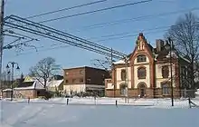 The station building, situated on the north side of the tracks, was designed by Paul Due. The brick structure features a mix of Romance and Gothic styles in the gable and windows in Art Nouveau. The station building is no longer used in conjunction with rail operations and instead used as a dormitory. It is listed as a heritage site.[6] Next to the station building there is parking for 120 cars.[12]