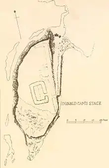 Stac Dhomnuill Chaim was documented in the late 19th century by the historian F W L Thomas who stated it was 100 feet (30 m) high and no more than 20 feet (6.1 m) long at the top. He described the promontory as almost cut off from the nearby shore by a very deep ravine, though it remained connected to the mainland by a rocky isthmus. The stack which is surrounded by the sea, was completely inaccessible except from the land side by a narrow path. According to Thomas this was guarded by 4 feet (1.2 m) to 5 feet (1.5 m) thick wall on the land side, in which there was a 2 feet (0.61 m) gap or gateway on the southern side. Upon the stack, Thomas described the remains of a cottage measuring 18.5 feet (5.6 m) long and 10 feet (3.0 m) wide, with walls that are 4.5 feet (1.4 m) thick. Connected to the cottage were the remains of a sheep pen.[2]