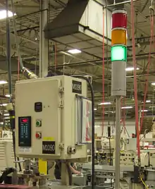 Stack lights (aka: signal tower lights, indicator lights, andon lights, warning lights, industrial signal lights, or tower lights) are commonly used on equipment in industrial manufacturing and process control environments to provide visual and audible indicators of a machine's status to machine operators, technicians, production managers and factory personnel. It is a form of andon - systems in manufacturing which identify errors as they happen.