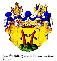 The Stackelberg family (Russian: Штакельберг, tr. Stakelberg; Latvian: Štakelbergi), also Stakelberg is a Baltic German noble family of German origin, represented at the Swedish[1] and Finnish houses of nobility.[2] Different branches of the Stackelberg family use different surnames; for instance, a nobiliary particle preposition i.e. "von".
