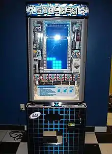Stacker is a game merchandiser manufactured by LAI Games, first produced in 2004. The goal of the game is to align rows of lights on top of each other. A player who stacks 11 rows can choose to take a minor prize. A minor prize is usually low in value, sometimes lower than the amount of money the player paid to play the game. A player who stacks the blocks to the top row wins the jackpot prize, called the "major prize." Major prizes vary from machine-to-machine but will often include high-value items such as game consoles, mobile phones, and gift cards.
