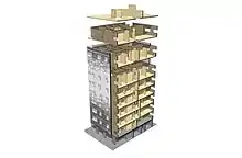 Stadthaus is the first high-density housing building to be built from pre-fabricated cross-laminated timber panels.[6] It is the first building in the world of this height to construct not only load-bearing walls and floor slabs but also stair and lift cores entirely from timber.[6]